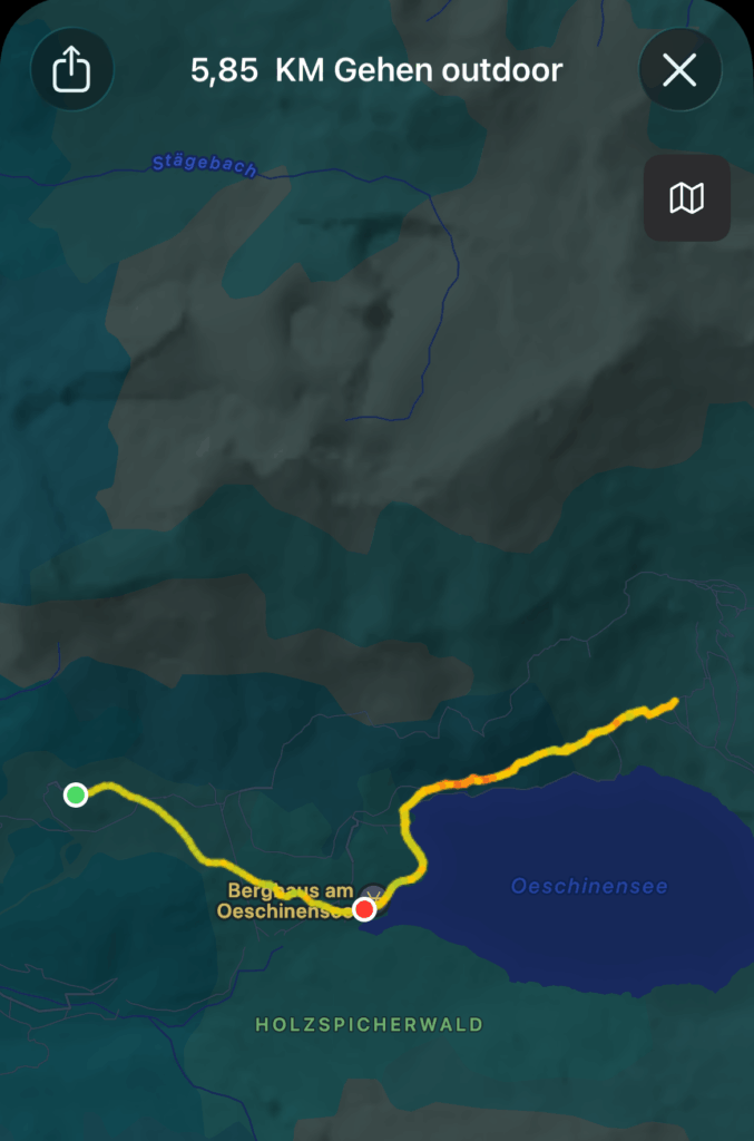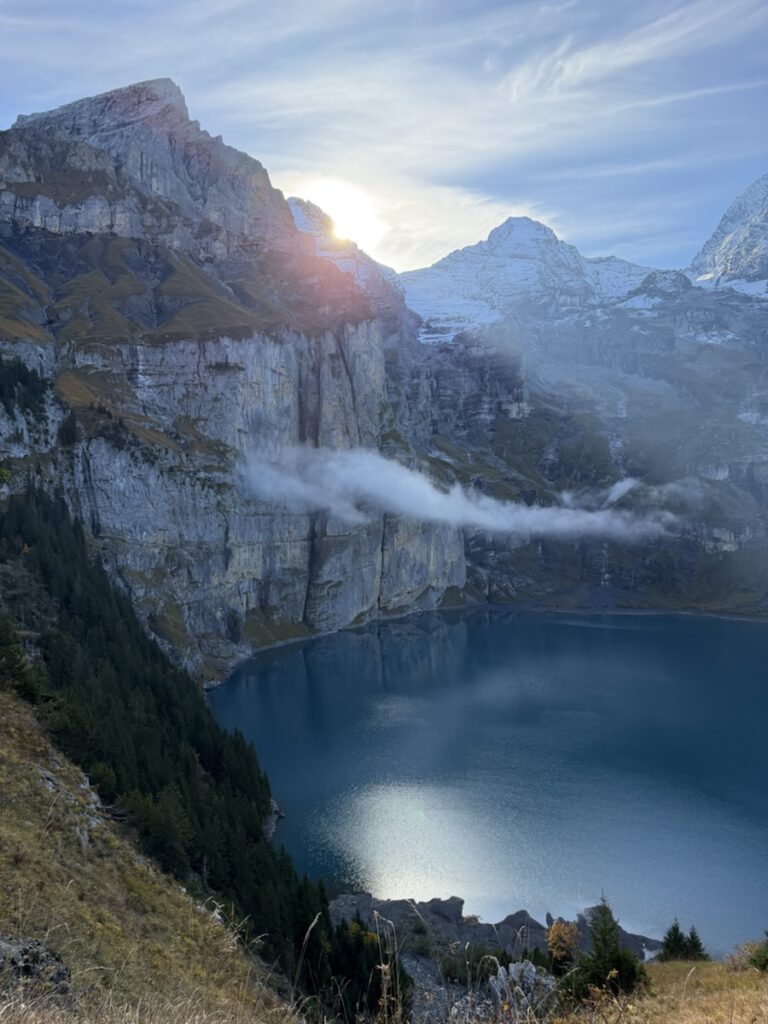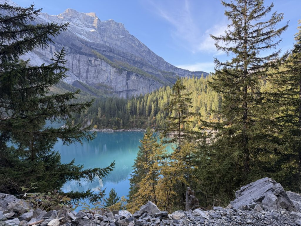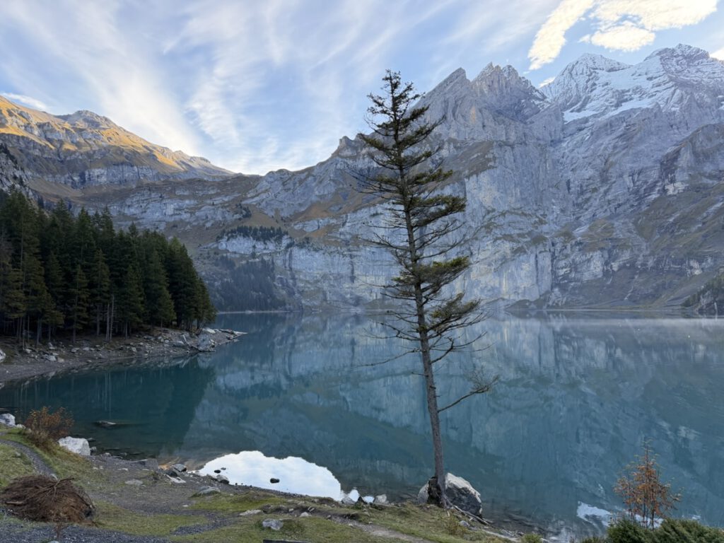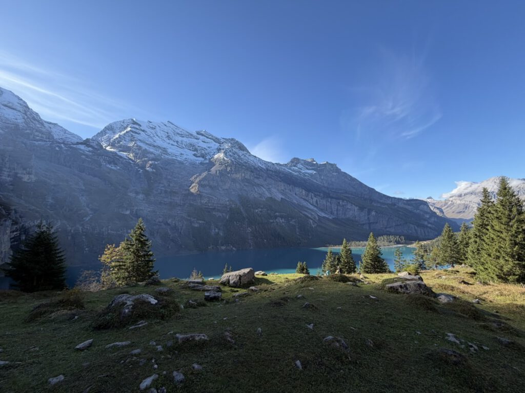 09.10.2025 – Tag 2: Nachdem wir gestern frühzeitig das Licht ausgemacht hatten zum Schlafen, sind wir heute auch früh aufgewacht. Um 7:30 Uhr sind wir aufgestanden, haben unser Frühstück an der Rezeption abgeholt sowie unseren Aufenthalt bezahlt. Gegen 8:45 Uhr nahmen wir direkt eine Gondel hoch auf den Berg, um dann zum Oeschinensee zu gehen. So früh war zum Glück noch nicht allzuviel los. Oben angekommen hatten wir ca. 30 Minuten Fußweg bis wir den See erreichten. Dort gab es eine Berghütte und die Möglichkeit sich ein Boot zu mieten, um auf den See rauszufahren. In dem See konnte man scheinbar Fische angeln. Wir gingen den Rundweg, ein Schotterweg, am Rande des Sees entlang. Das Wasser vom See war noch ganz glatt und still, die Sonne lugte bereits etwas über die Berge und erleuchtete nach und nach immer mehr von dem Bergsee in Sonnenlicht. Den „normalen“ Weg am See hatten wir recht schnell hinter uns gebracht. Es gab noch einen Weg der etwas weiter hinauf führte und zum wandern einlud. Insbesondere die ersten Meter gingen steil bergauf. Der Weg war verhältnismäßig gut angelegt, aber sehr schotterig. So wanderten wir einige Zeit entlang. Wenn man im Schatten der Berge war und stehen blieb und kurz die Aussicht zu genießen hatten die Sonnenstrahlen einen auch schon bald wieder eingeholt. Wir gingen den Weg nicht bis zum Schluss und drehten irgendwann wieder um. Es war sonst wohl eine Wanderung von ca. 4 Stunden. Auf dem Rückweg zur Berghütte, wo wir uns etwas zu Essen als Stärkung holten, konnten wir zweimal ein dunkelbraunes Eichhörnchen beobachten. Es waren viele Asiaten unterwegs. Auch ein Pärchen mit Fotograf, die in ihrem Hochzeitsdress Fotos gemacht haben. Wir haben uns nicht lange dort aufgehalten und gingen zurück zur Bergbahnstation. Der Weg dorthin ging wieder einige Meter bergauf. An der Bergstation genossen wir bei einem kleinen Eis noch ein wenig die Aussicht aufs Tal und fuhren wieder bergab.