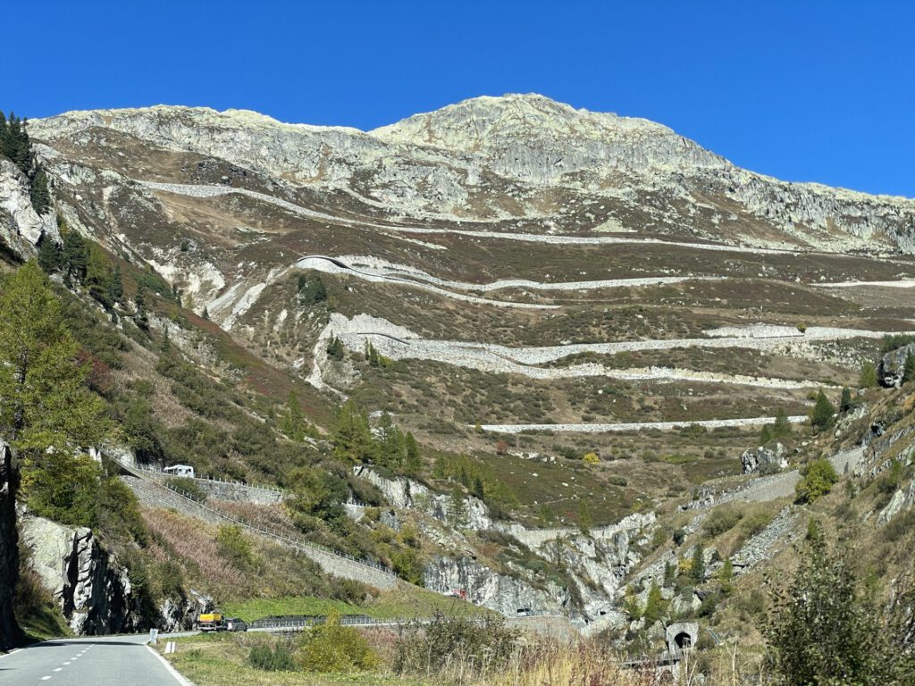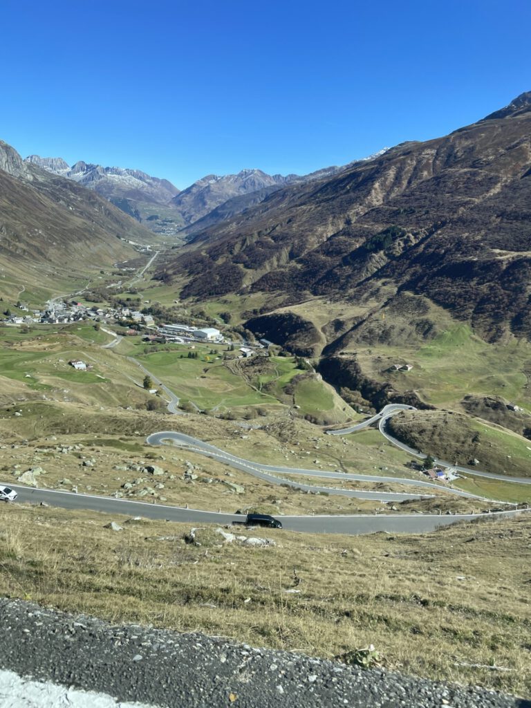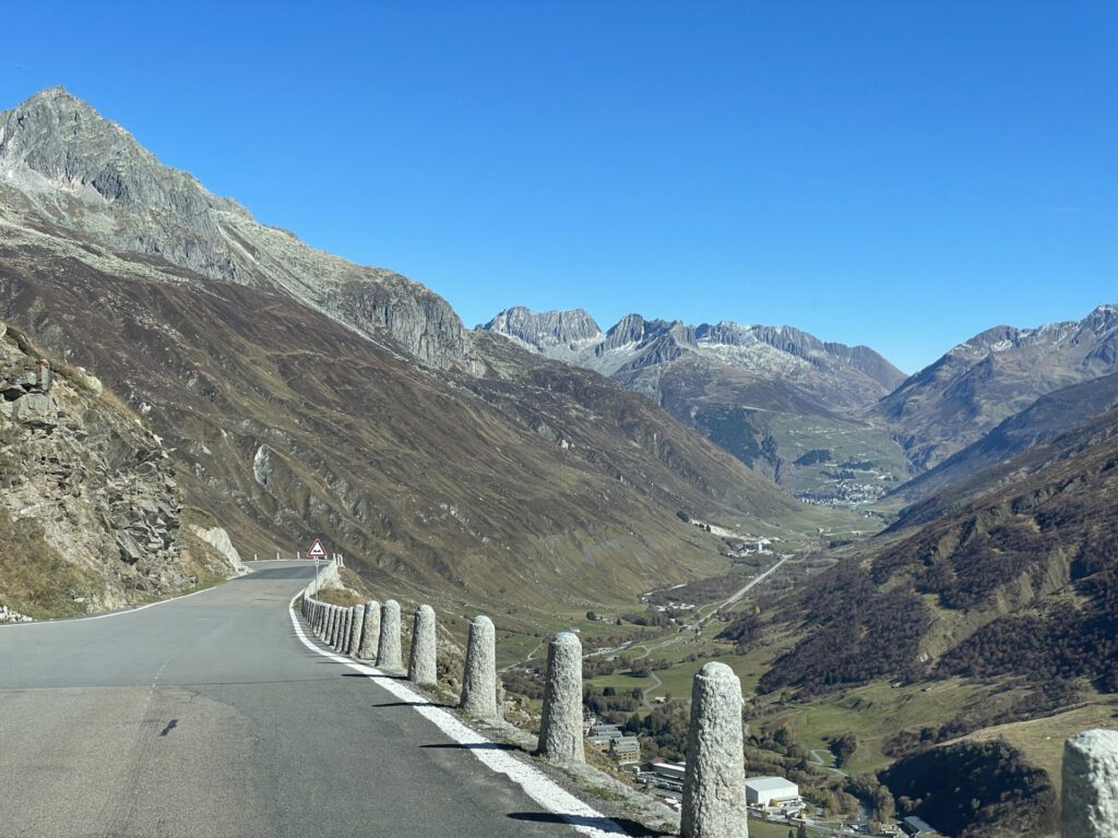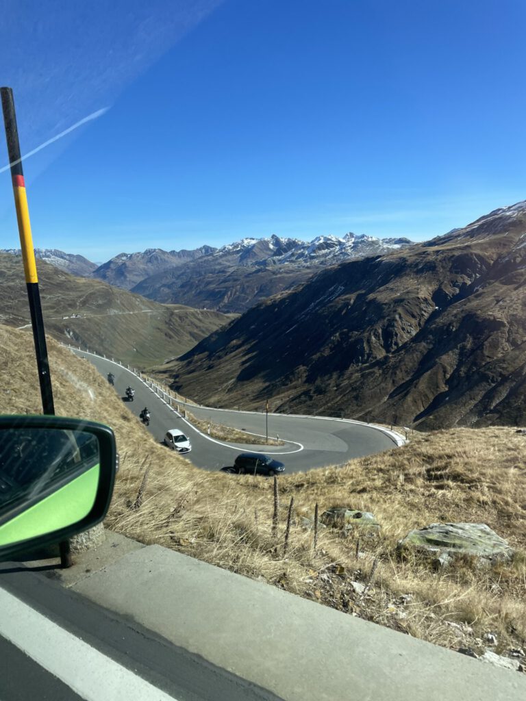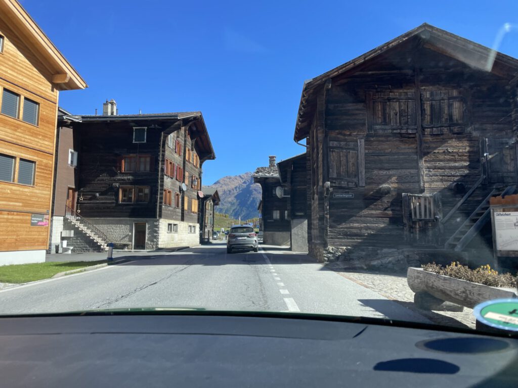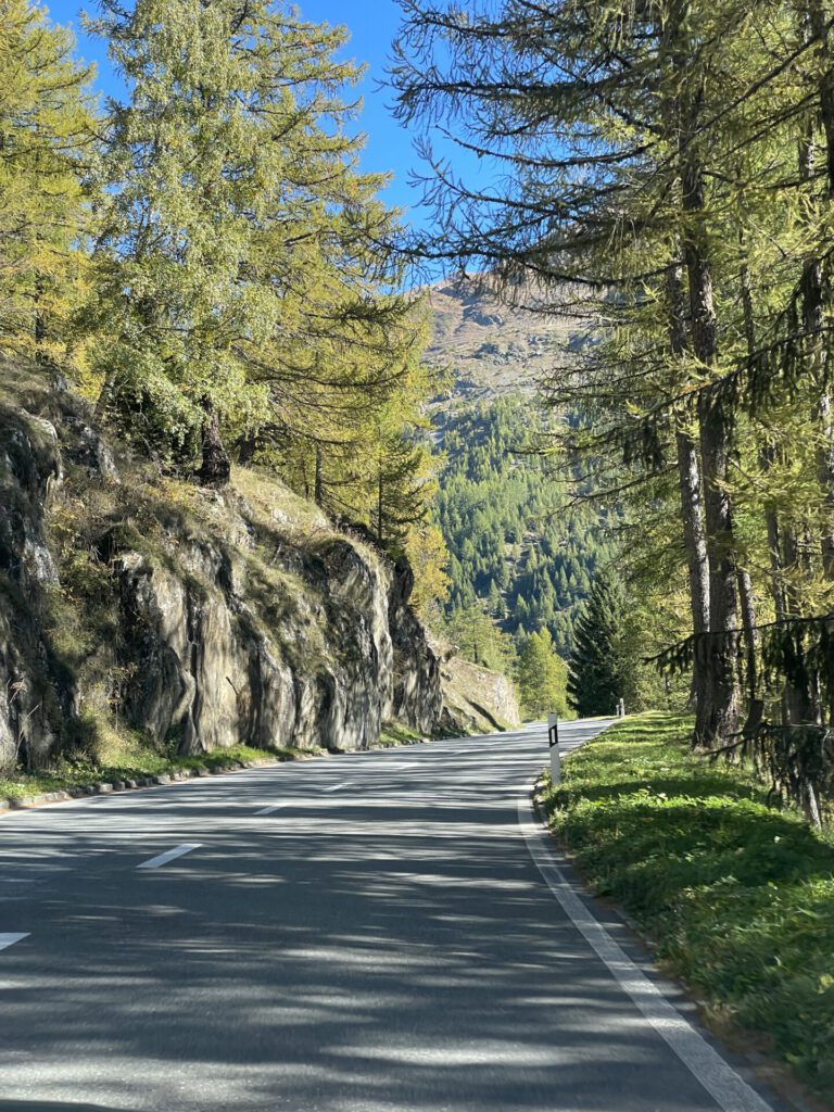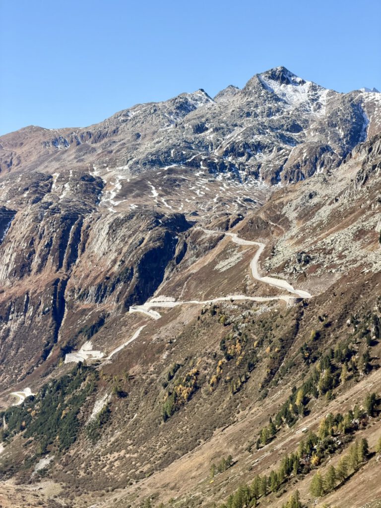11.10.2025 – Tag 4: Heute schliefen wir ein bisschen aus und standen gegen 8 Uhr auf. Die Nacht war wieder kalt und es hatte ein bisschen Bodenfrost gegeben. Wir packten unsere Sachen zusammen. Während wir das taten und gerade etwas absprachen, kamen ein paar Spatzen angeflogen und ließen sich am Auto nieder. Sie hüpften immer dichter und waren nur noch wenige Zentimeter von mir entfernt. Der eine Vogel flog dann sogar hoch und schaute durch die offene Autotür uns Auto. Ich konnte ihn zum gluck davon abhalten ins Auto zu fliegen. Um 10 Uhr fuhren wir vom Campingplatz. Wir lösten noch unseren Gutschein beim Coop ein, den wir an der Rezeption erhalten hatten und kauften noch ein paar Kleinigkeiten. Heute wollten wir etwas mehr Strecke machen. Wir hatten die letzten Tage immer wieder überlegt, wo wir als nächstes hinfahren sollten. Es gab die Option zum Jungfraujoch zu fahren. Der höchstgelegene Bahnhof Europas. Allerdings hätten wir dafür wieder auf die andere Seite der berge gemusst und die Tickets für die Fahrt dort hoch waren uns mit rund 230€ pro Person etwas zu teuer. Auch wenn es sich vermutlich lohnen würde. Ich hatte im Vorfeld auch noch andere Sehenswürdigkeiten herausgesucht, auf die wir jetzt aber keine große Lust hatten. Somit machten wir uns heute auf in das Kanton Graubünden zu fahren, was für mich der ursprüngliche Grund für den Schweizurlaub war. Aufgrund der sich im Herbst gelb färbenden Lärchen, die es dort zahlreich gab, sollte es ein herrlicher Anblick sein. Zumal wir auch wirklich die ganze Zeit „goldener Herbst“-Wetter hatten. Auf unserem Weg nach Graubünden fuhren wir noch ein paar Spots an, die ich rausgesucht hatte. Die Straße führte uns durch die Berge vorbei am Aletschgletscher, dem größten Gletscher der Alpen und durch viele verschiedene Ortschaften mit ihren bezeichnenden dunklen Holzhäusern. Wir durchquerten das Kanton Uri ein kurzes Stück als wir den Furkapass fuhren. Dort gab es an einer der Haarnadelkurven das weltbekannte Hotel Belvédère am Rhone Gletscher. Auf den Straßen waren einige Sportwagen mit übermütigen Autofahrern unterwegs, wodurch die Fahrradfahrer auf der Strecke noch gefährlicher lebten als eh schon. Die Straßen waren teilweise sehr schmal und hatten keine Leitplanke. Das fahren mit Anhängern war verboten und doch kam uns ein Auto mit Wohnwagen entgegen. Die Serpentinenstraßen waren teilweise echt krass und zeitgleich schön zu fahren. Nach dem Furkapass kamen wir an der James Bond Straße entlang. Ebenfalls Serpentinen, die in dem Streifen Goldfinger als Kulisse dienten.