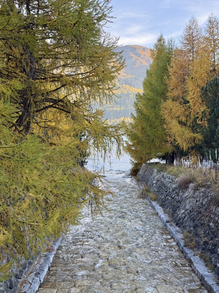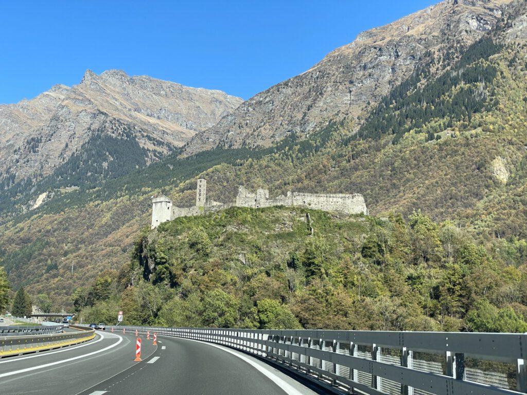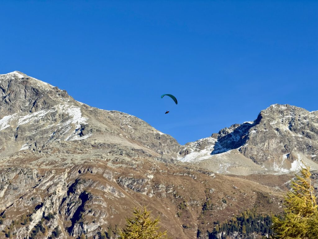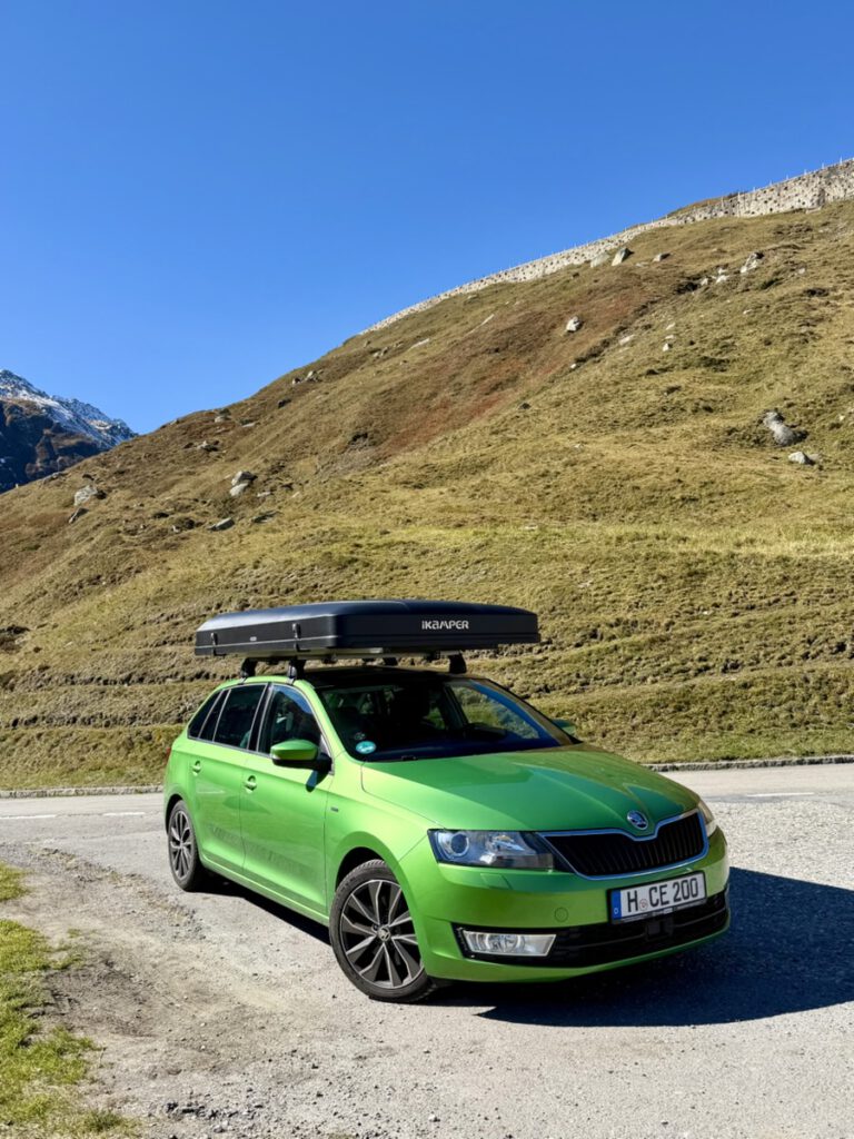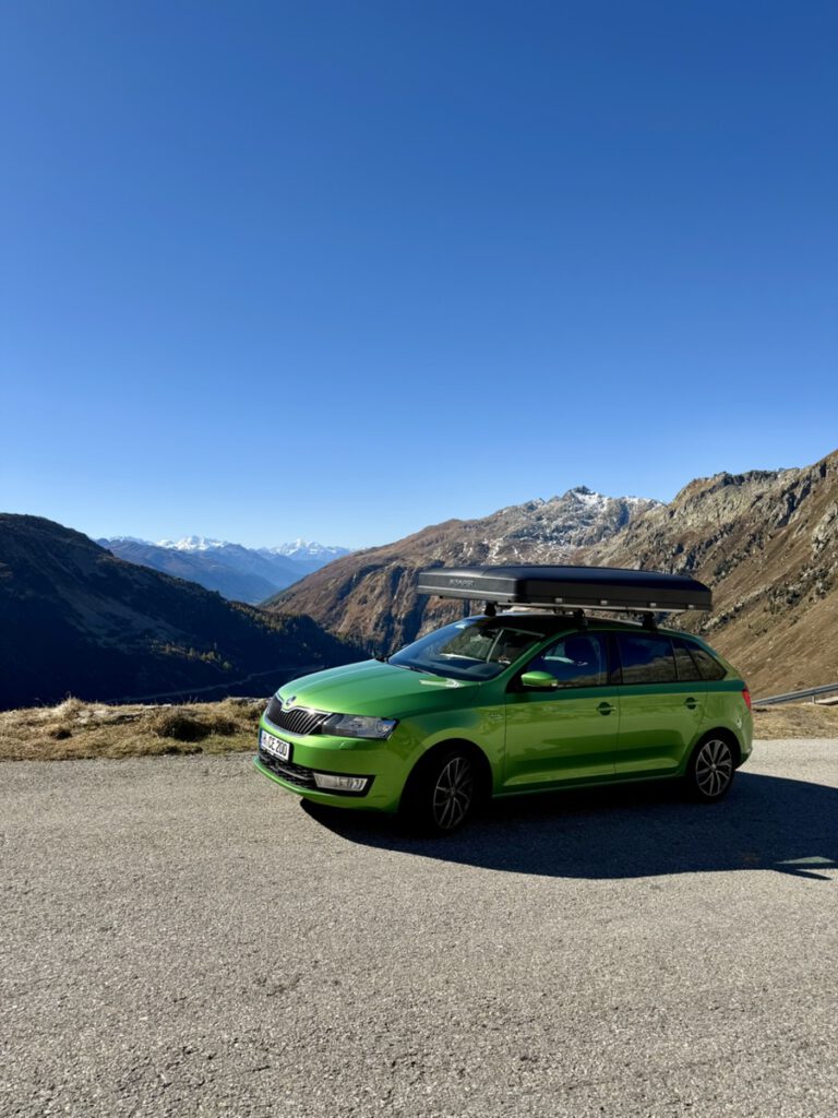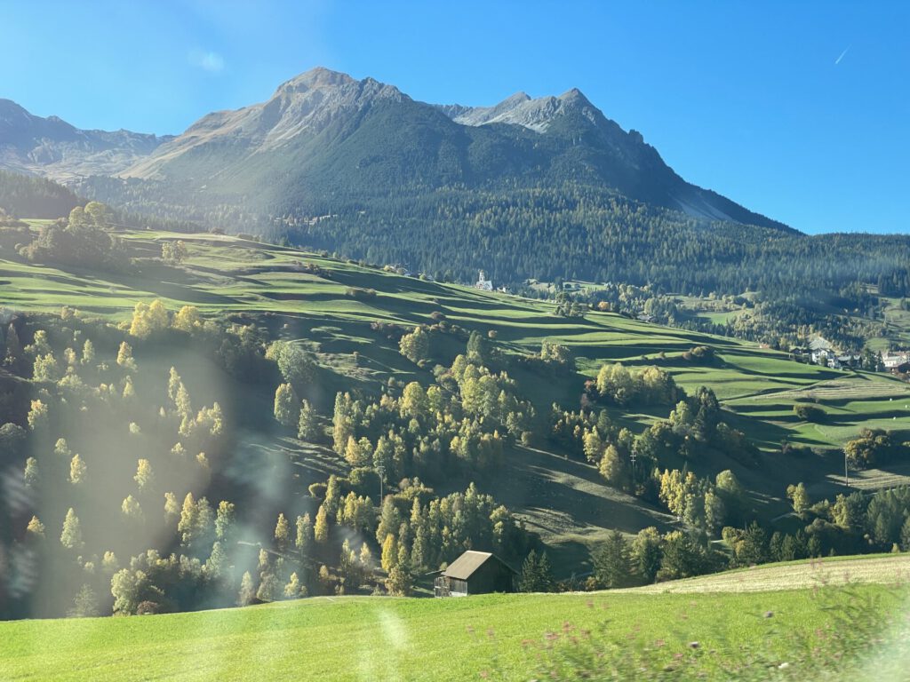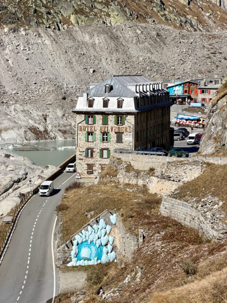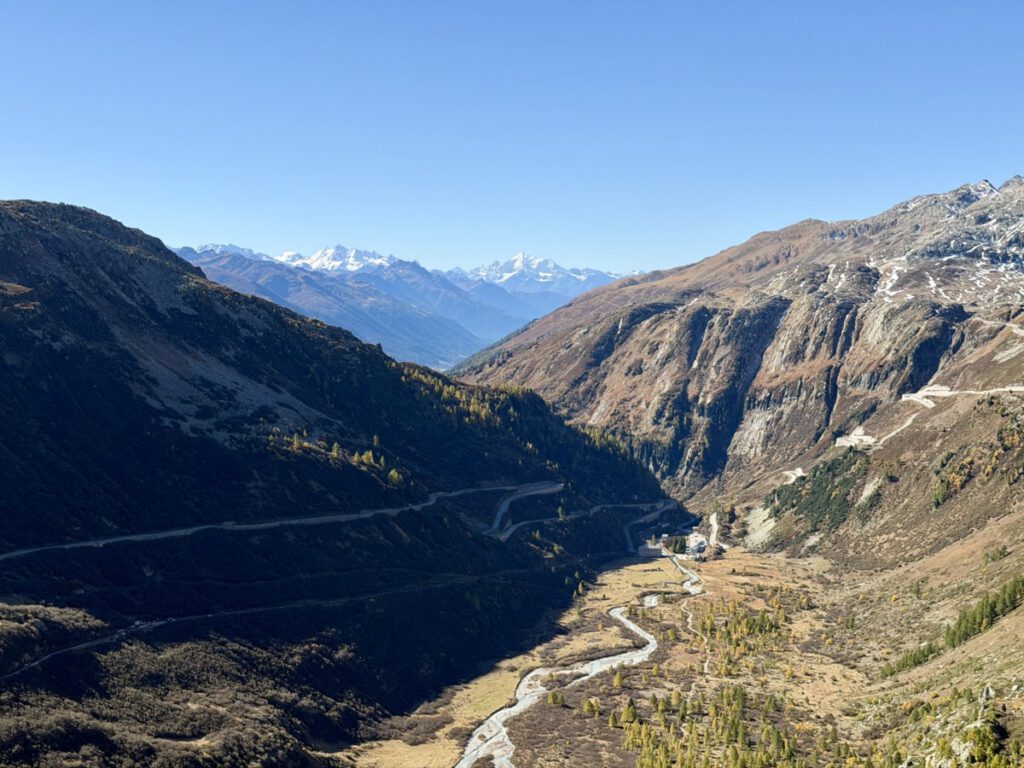 11.10.2025 – Tag 4: Heute schliefen wir ein bisschen aus und standen gegen 8 Uhr auf. Die Nacht war wieder kalt und es hatte ein bisschen Bodenfrost gegeben. Wir packten unsere Sachen zusammen. Während wir das taten und gerade etwas absprachen, kamen ein paar Spatzen angeflogen und ließen sich am Auto nieder. Sie hüpften immer dichter und waren nur noch wenige Zentimeter von mir entfernt. Der eine Vogel flog dann sogar hoch und schaute durch die offene Autotür uns Auto. Ich konnte ihn zum gluck davon abhalten ins Auto zu fliegen. Um 10 Uhr fuhren wir vom Campingplatz. Wir lösten noch unseren Gutschein beim Coop ein, den wir an der Rezeption erhalten hatten und kauften noch ein paar Kleinigkeiten. Heute wollten wir etwas mehr Strecke machen. Wir hatten die letzten Tage immer wieder überlegt, wo wir als nächstes hinfahren sollten. Es gab die Option zum Jungfraujoch zu fahren. Der höchstgelegene Bahnhof Europas. Allerdings hätten wir dafür wieder auf die andere Seite der berge gemusst und die Tickets für die Fahrt dort hoch waren uns mit rund 230€ pro Person etwas zu teuer. Auch wenn es sich vermutlich lohnen würde. Ich hatte im Vorfeld auch noch andere Sehenswürdigkeiten herausgesucht, auf die wir jetzt aber keine große Lust hatten. Somit machten wir uns heute auf in das Kanton Graubünden zu fahren, was für mich der ursprüngliche Grund für den Schweizurlaub war. Aufgrund der sich im Herbst gelb färbenden Lärchen, die es dort zahlreich gab, sollte es ein herrlicher Anblick sein. Zumal wir auch wirklich die ganze Zeit „goldener Herbst“-Wetter hatten. Auf unserem Weg nach Graubünden fuhren wir noch ein paar Spots an, die ich rausgesucht hatte. Die Straße führte uns durch die Berge vorbei am Aletschgletscher, dem größten Gletscher der Alpen und durch viele verschiedene Ortschaften mit ihren bezeichnenden dunklen Holzhäusern. Wir durchquerten das Kanton Uri ein kurzes Stück als wir den Furkapass fuhren. Dort gab es an einer der Haarnadelkurven das weltbekannte Hotel Belvédère am Rhone Gletscher. Auf den Straßen waren einige Sportwagen mit übermütigen Autofahrern unterwegs, wodurch die Fahrradfahrer auf der Strecke noch gefährlicher lebten als eh schon. Die Straßen waren teilweise sehr schmal und hatten keine Leitplanke. Das fahren mit Anhängern war verboten und doch kam uns ein Auto mit Wohnwagen entgegen. Die Serpentinenstraßen waren teilweise echt krass und zeitgleich schön zu fahren. Nach dem Furkapass kamen wir an der James Bond Straße entlang. Ebenfalls Serpentinen, die in dem Streifen Goldfinger als Kulisse dienten.