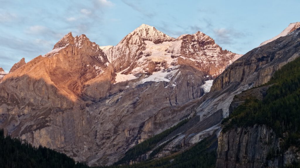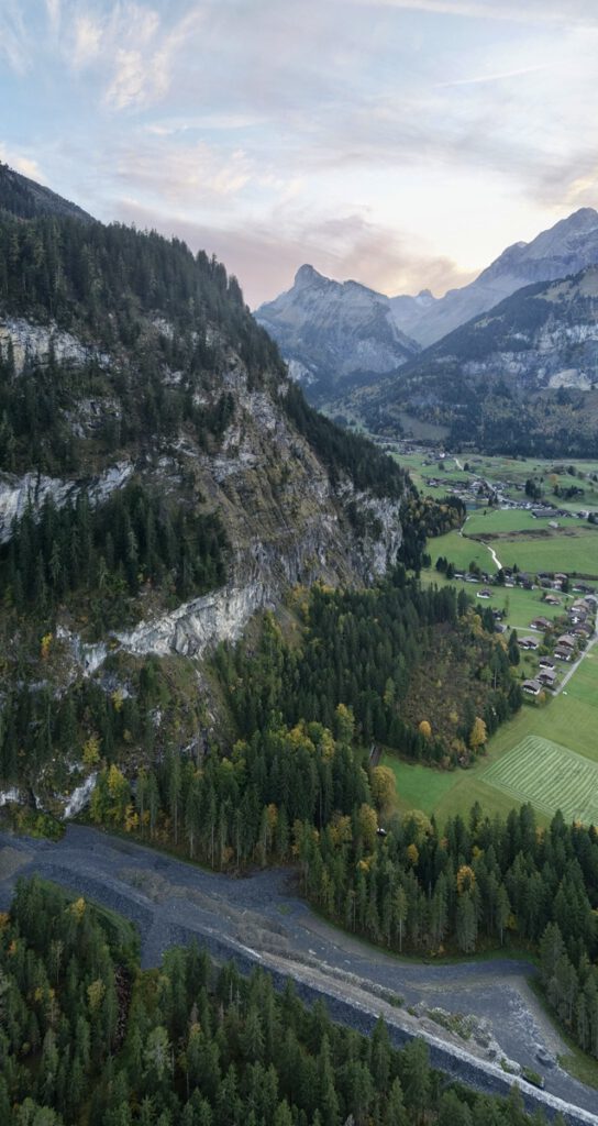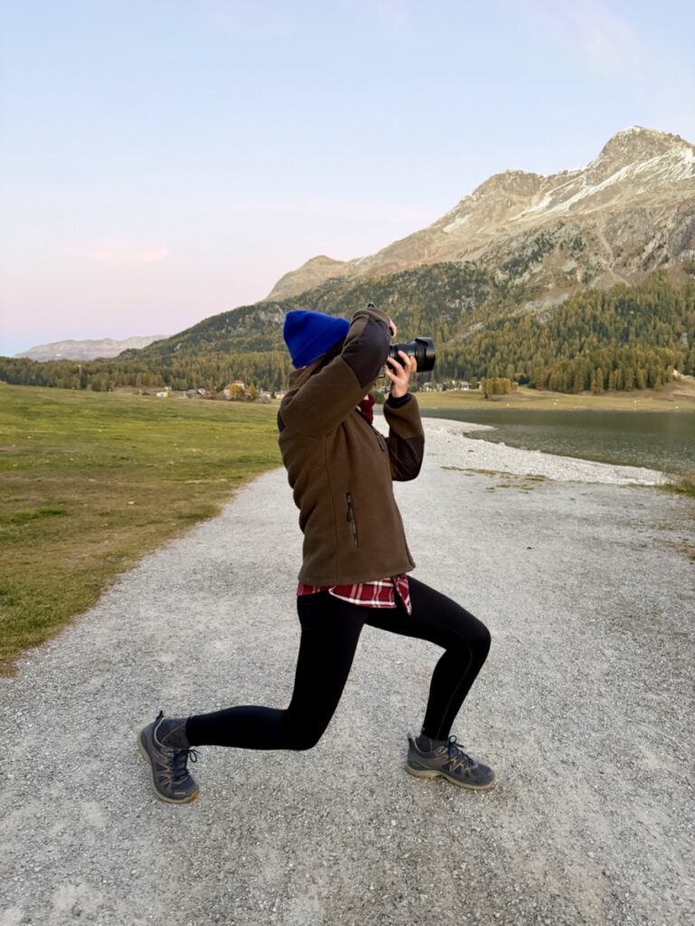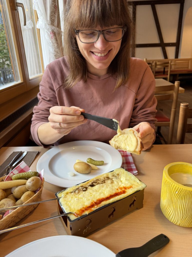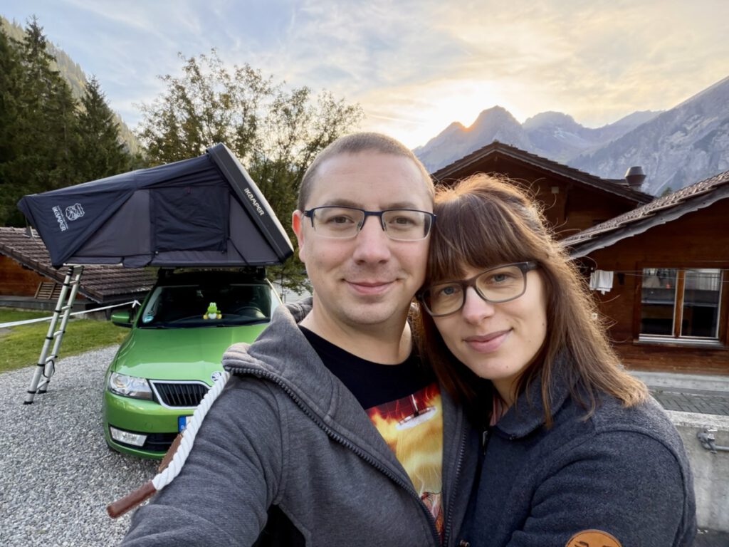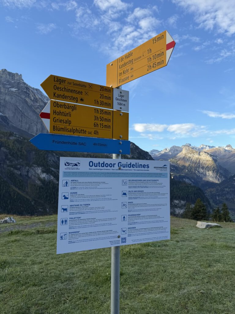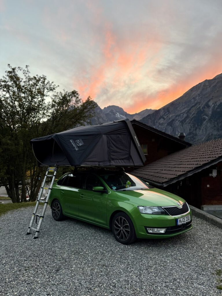 Unser erstes Ziel war die Ortschaft Kandersteg im Kanton Bern. Bei Basel überquerten wir die Grenze. Ich unterstützte David bei der Route und achtete darauf, dass wir nicht falsch abbogen. Nachdem wir Basel hinter uns gelassen hatten, kam auch bald die Stadt Bern. Bisher war es ähnlich bergig wie im Schwarzwald. Doch nachdem wir durch Bern durch waren, erblickten wir die ersten großen Berge, die sich im Dunst abzeichneten. Manche nur als schwarze Silhouette, bei anderen wurden die schneebedeckten Spitzen von der Sonne angestrahlt. Teilweise hingen die Wolken vor den Bergen, die sie dadurch noch imposanter wirken ließen. Nach einem kurzen Sprung in den Supermarkt Coop kamen wir gegen 16 Uhr auf dem Campingplatz in Kandersteg auf 1.200m an. Direkt neben dem Campingplatz war die Seilbahnstation zum Oeschinensee. Sehr praktisch. Der Platzbesitzer war sehr nett und wir konnten uns einen von zwei Stellplätzen aussuchen. Für morgen zum Frühstück hatten wir uns auch etwas vom Bäcker bei ihm bestellt. An den Gebäude wo alle Gäste mal vorbeikommen, hängen unterschiedliche kleine Zettel mit verschiedenen Sprüchen drauf, die einem ein Lächeln ins Gesicht zauberten. Wir richteten uns ein und gingen im Restaurant des Campingplatzes zum Abend essen. Wir gönnten uns direkt eine Schweizer Spezialität: Schweizer Raclette mit Kartoffeln, Silberzwiebeln und sauren Gurken. Eigentlich hatten wir überlegt noch heute zum See hochzufahren, aber wir hätten nur eine Stunde Zeit gehabt, bis die letzte Gondel fuhr. Also verlegten wir das auf den morgigen Tag. Nach dem Essen nahm sich David seine Drohne und ich meine Kamera und wir gingen etwas den Berg hinauf, um den Sonnenuntergang zu beobachten und ein paar Fotos zu machen. Nicht nur die Blätter der Laubbäume waren in Herbstfarben, sondern auch die Wolken färbten sich nach dem Sonnenuntergang schön rosa. Im Anschluss machten wir uns bettfertig.