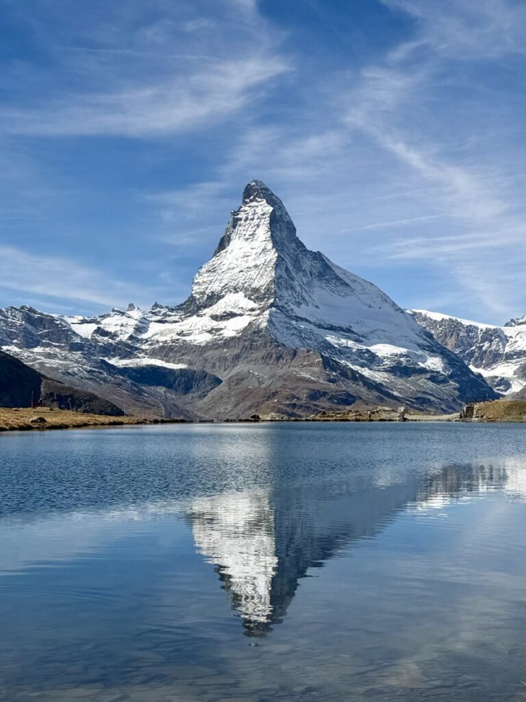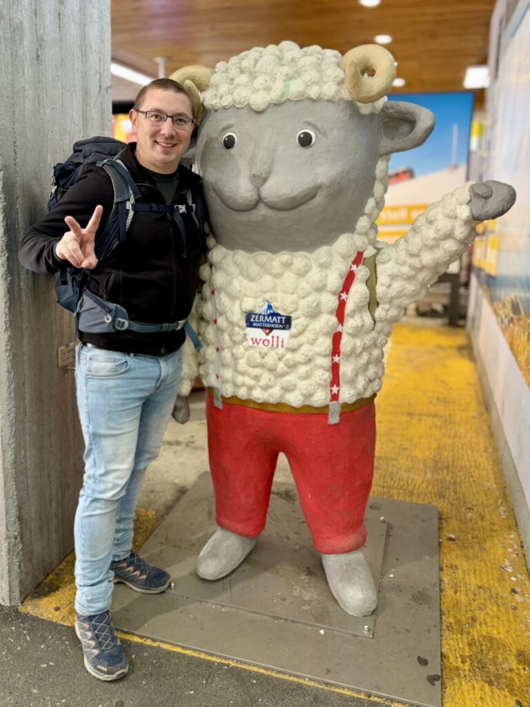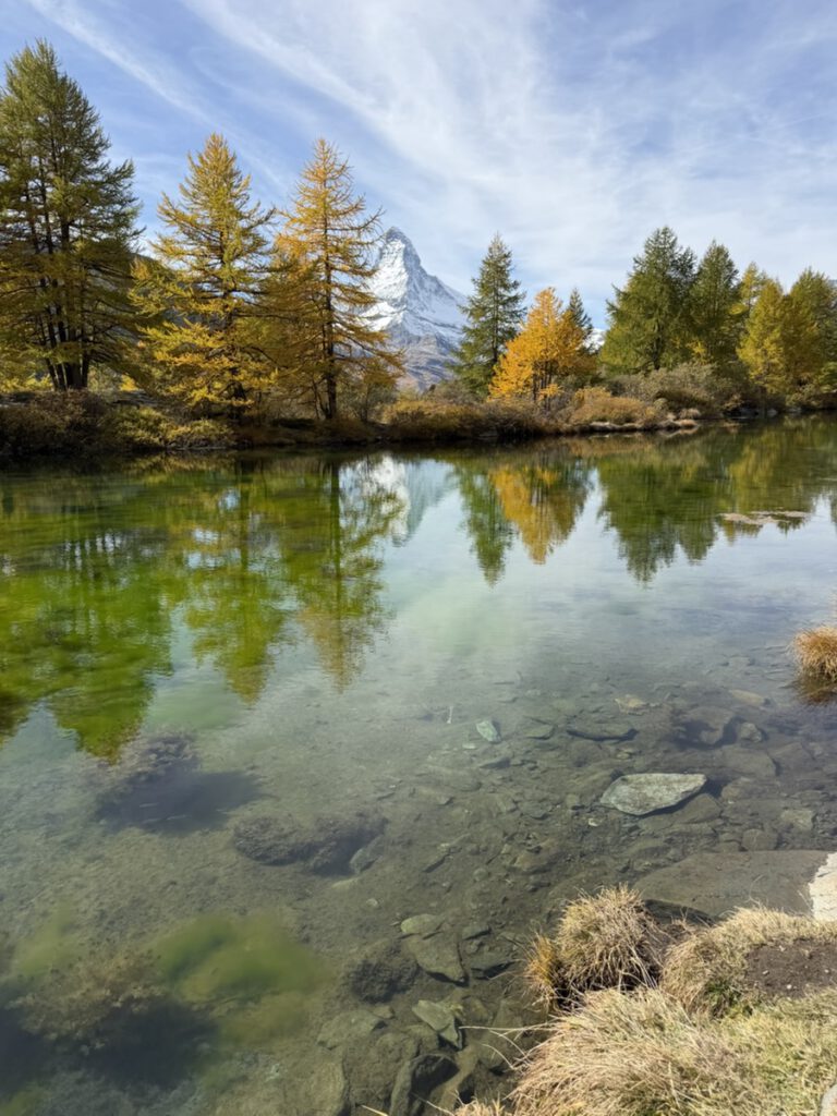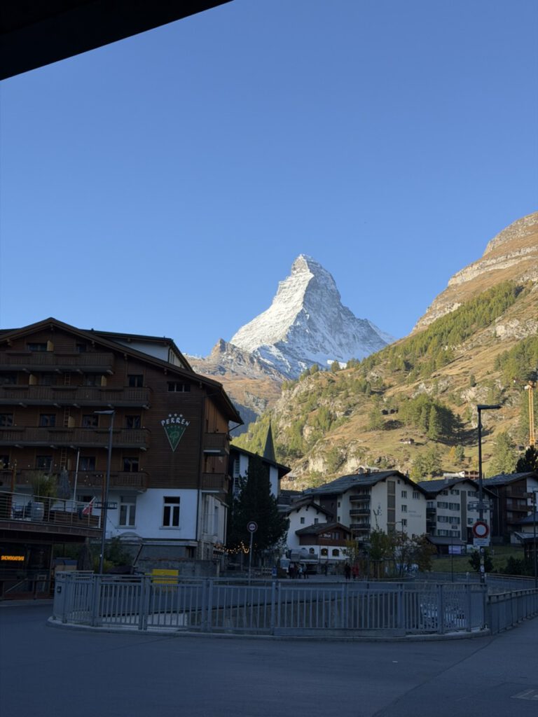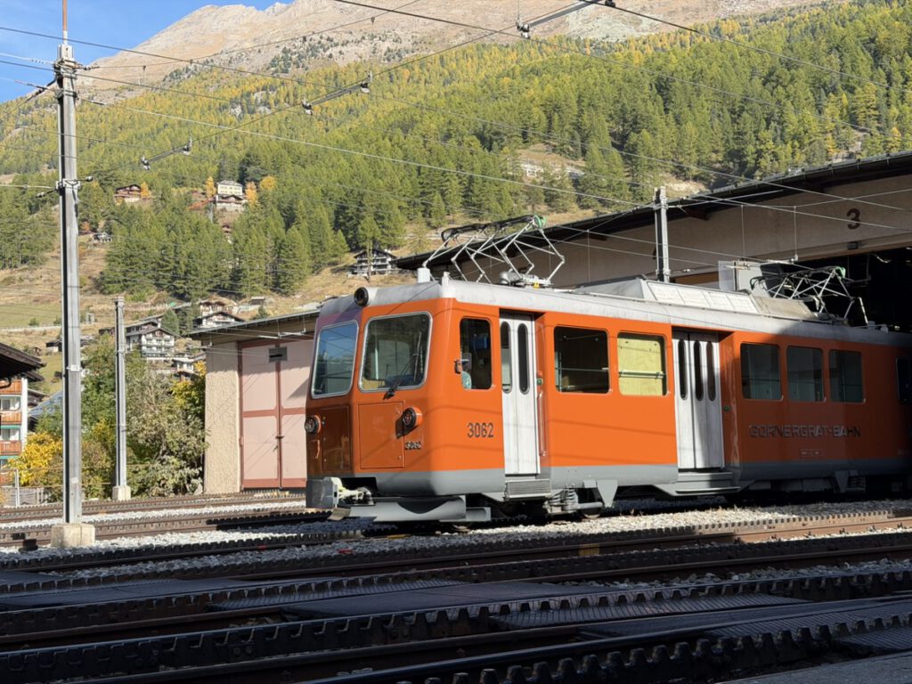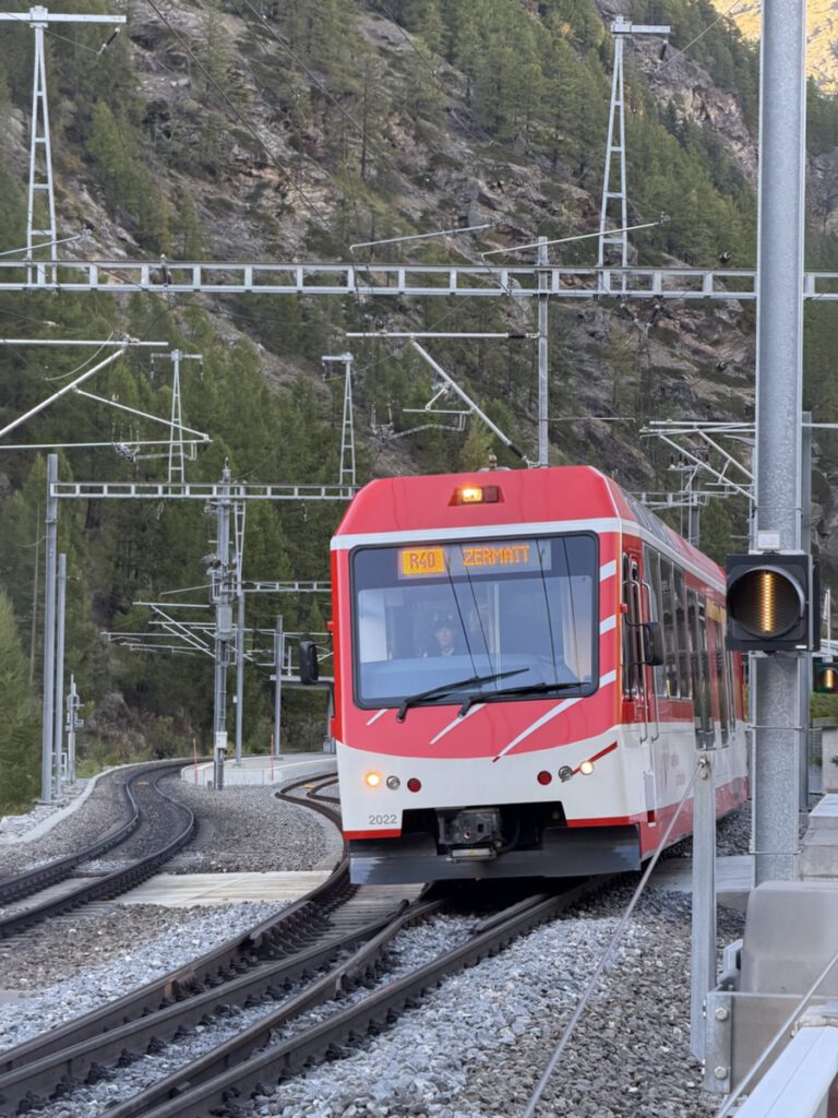 10.10.2025 – Tag 3: Wir wachten wieder gegen 7 Uhr auf uns pellten uns gegen 7:30 Uhr langsam aus dem Schlafsack. Es hatte in der Nacht ca. 3 Grad gehabt. Das Wetter war wieder herrlich sonnig und perfekt zum Wandern. Wir machten uns fertig, frühstückten ein bisschen Knäckebrot und meldeten uns bei der Rezeption zum bezahlen. Danach ging es mit Sack und Pack zum nahegelegenen Bahnhof, wo uns der Zug nach Zermatt bringen sollte. Dass der Campingplatz direkt neben dem Bahnhof war, war einerseits schön, wegen des kurzen Weges, andererseits fuhren doch recht viele Züge, mindestens alle 20 Minuten, was jedes mal doch etwas laut war. Ohne Gehörschutz beim schlafen, wären wir bis zum letzten Zug und ab dem ersten Wach gewesen. Nach Zermatt kam man mit dem Auto nur wenn man eine polizeiliche Genehmigung hatte. So hatten uns die Straßenschilder zumindest informiert. Deswegen die Zugverbindung. Der Zug pendelte tatsächlich auch nur zwischen den beiden Station Täsch und Zermatt. In Zermatt angekommen, gingen wir zur Standseilbahn, die uns an unser Ziel bringen sollte. Wir kauften uns zwei Tickets und stiegen in die Bahn ein. Wir starteten auf 1.620m ü.M. und kamen nach ca. 5-10 Minuten auf 2.288m ü.M. an der Station Sunnegga an. Und hier zeigte sich schon das Wahrzeichen der Schweiz, das Matterhorn. Ein beeindruckender Berg, der mit seinen 4.478m zu den höchsten der Alpen zählt und mit seiner markanten Form sogar als Symbol für die bekannte Schokolade Toblerone dient. Wir wollten den 5-Seenweg gehen, den wir im Vorfeld etwas geändert hatten und nur an 3 Seen vorbeikommen sollten. Von jedem See aus, sollte man einen schönen Blick aufs Matterhorn haben.