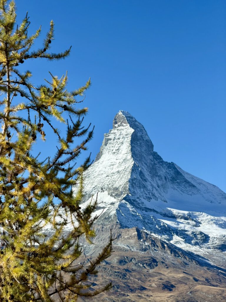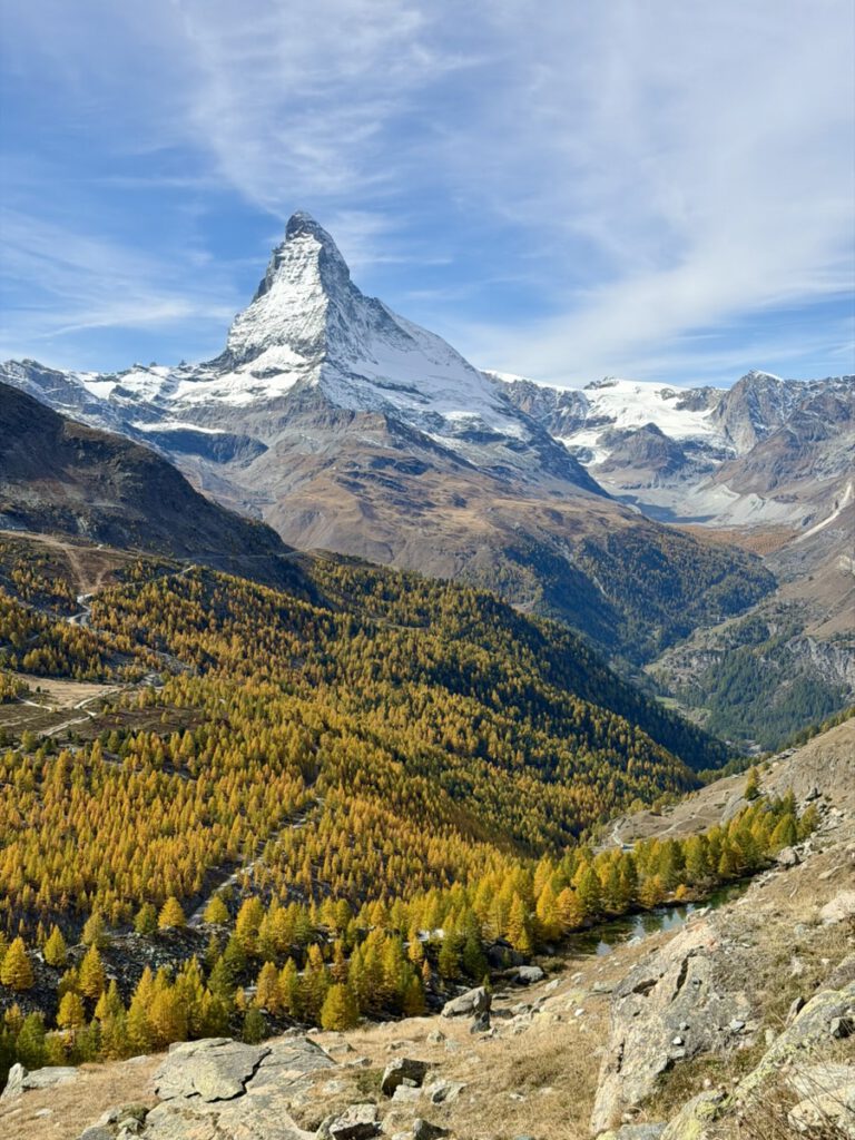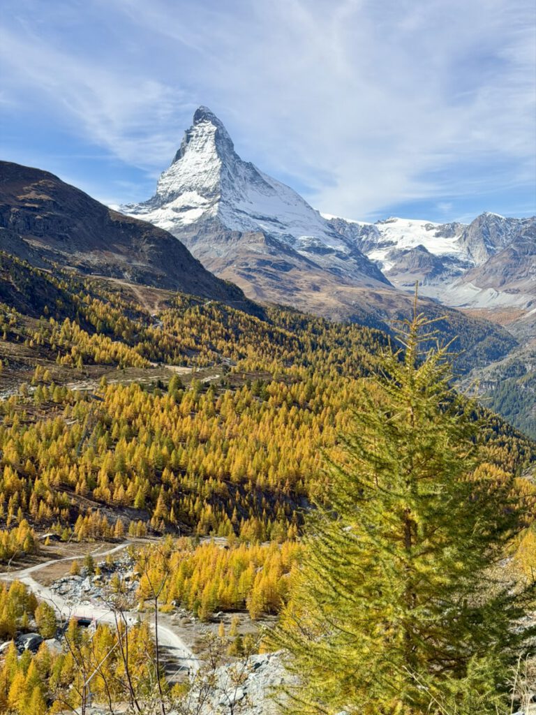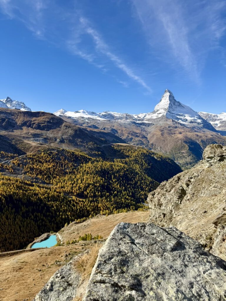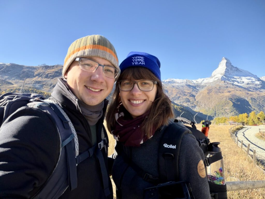Eigentlich sollte unsere Wanderung ab der Bahnstation Blauherd auf 2.613m beginnen, doch die Gondel war derzeit geschlossen und öffnete erst wieder zur Skisaison. Somit mussten wir die ersten 1,5km mit 200 Höhenmetern selber bezwingen. Das war ganz schön anstrengend, besonders ich mit meinen 8-10 kg Kamerazeug war ein bisschen bedient. Wir ließen uns Zeit und versuchten die Meter bedacht zu erklimmen und legten immer wieder Verschnaufpausen ein. Nachdem wir für den ersten Aufstieg ca. 1,5 Stunden gebraucht hatten, ging es zum Glück etwas flacher weiter.  Die nächsten Kilometer gingen deutlich leichter, immer das Matterhorn im Rücken und so kamen wir recht schnell am ersten See an, dem Stellisee. Hier tummelten sich bereits andere Wanderer, die eine kleine (Foto-)Pause machten und die Aussicht genossen. Auch wir machten es ihnen gleich. Wir hatten jetzt ungefähr die hälfte der Strecke hinter uns gebracht und stärkten uns ein wenig. Es hatte hier ca. 5 Grad. Durch die körperliche Anstrengung und die strahlende Sonne, die einen zusätzlich wärmte, fühlte es sich definitiv nicht danach an, sondern eher nach 10-15 Grad. Immer mal wieder zog ein kleiner Luftzug durch und dann merkte man, dass es doch eher kühler als warm war. Immer wieder sahen wir Gleitschirmflieger, die mit einem Gast an Bord von einem Berggipfel ins Tal nach Zermatt flogen. Auch waren ständig Helicopter in der Luft, die scheinbar verschiedene Dinge von A nach B transportierten. Für uns ging es weiter, etwas bergab. Der Weg war rechts und links von Lärchen gesäumt, die hier in den höheren Lagen teilweise bereits komplett gelb gefärbte Nadeln hatten. Wir kamen am nächsten See an, dem Grindjisee. Der Ausblick auf das Matterhorn war ein völlig anderer, als von dem ersten See. Hier hielten wir uns nicht lange auf und gingen weiter. Der Weg wurde wieder schmal und führte uns am Berghang entlang. Zur linken eine Aussicht auf die gefärbten Lärchen, nach vorne der Blick aufs Matterhorn. Es gab wieder ein paar kleine Anstiege zu bewältigen. Bei einer Sitzbank machten wir noch mal eine kleine Essens- und Trinkpause bevor wir die letzte Etappe angingen. Es dauerte nicht lange und wir kamen am dritten und letzten See, dem Leisee an. Die Aussicht war relativ unspektakuläre. Dafür gab es hier direkt einen Kinderspielplatz und ein paar Holzliegen zum relaxen. Es war auch nicht mehr weit bis zu unserem Ausgangspunkt Sunnegga, nur noch ein paar Meter hoch. Oben wieder angekommen, setzten wir uns auf die Aussichtsterasse und aklimatisierten uns. Wir waren um 10:20 gestartet und hatten für die 7,9km und 422 Höhenmeter gute 4 Stunden gebraucht. Wir denken, dass das ein sehr guter Schnitt ist.