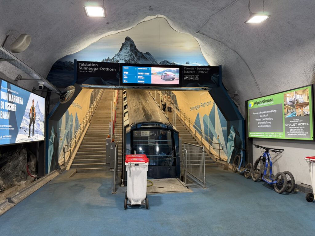 Wir fuhren wieder mit der Standseilbahn runter nach Zermatt. Die Standseilbahn führt übrigens durch den Berg nach oben bzw. unten. (Eine Standseilbahn ist eine Seilbahn, bei der die Wagen auf Schienen oder anderen festen Führungen fahren und durch ein oder mehrere Seile gezogen – nicht getragen – werden. Mit diesem Verkehrsmittel können auf kurzer Strecke beträchtliche Höhenunterschiede überwunden werden. Bei Bergstrecken verkehren üblicherweise zwei Wagen oder Wagengruppen, die fest mit einem Drahtseil verbunden sind, das in der Bergstation über eine Seilscheibe geführt wird. Die beiden Wagen oder Wagengruppen am Drahtseil halten sich ungefähr im Gleichgewicht, so dass für den Antrieb der Bahn nur kleine Kräfte aufgebracht werden müssen.) Dann gingen wir quasi ohne große Umwege zurück zum Bahnhof, um mit dem Zug zurück nach Täsch zu fahren. In Zermatt fuhren hauptsächlich elektrisch betriebene kleine Fahrzeuge umher. Sowohl um Güter zu transportieren, aber auch für Personenbeförderung. Ähnlich wie auf einer Insel im Norden, wo der Autoverkehr verboten war. Zurück am Campingplatz angekommen, hatten wir uns eine dusche redlich verdient und gingen danach in einem Restaurant lecker essen. Danach fielen wir ins Bett.