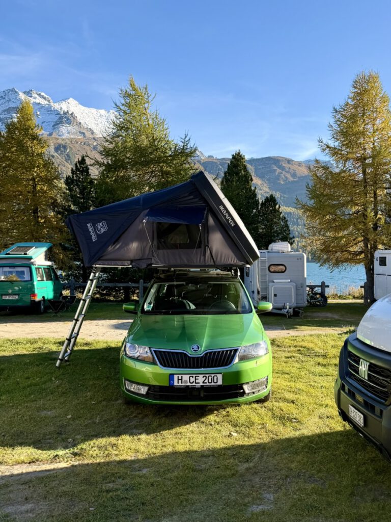 Als nächstes führte uns der Weg in das Kanton Tessin, das eher italienischsprachig war und wir kurzzeitig nicht sicher waren, ob wir vielleicht doch eher in Italien waren, als in der Schweiz, weil auch alle Straßenschilder plötzlich auf italienisch waren. Wir fuhren den Gotthardpass entlang und hatten immer wieder Lüftungsschächte vom Gotthardtunnel zu sehen. Die alte Passstraße wollte ich eigentlich fotografieren, aber es war nicht möglich anzuhalten, weil auf dem Parkplatz, wo man die Aussicht gehabt hätte, eine Baustelle war. Also fuhren wir weiter, die Autobahn entlang nach Graubünden. Im Vorfeld hatten wir uns eine Vignette im Internet gekauft für 40 CHF. Das war wohl der günstigste Preis und hatte eine Gültigkeit von 3 Monaten. Wir empfanden die Schweiz bisher als dicht besiedelt. Dort wo gebaut werden konnte, wurde gebaut. Manchmal war zwischen den Bergen nicht viel Platz, weshalb es alles ziemlich eng wirkte. Wir fuhren noch einige Zeit weiter und durchfuhren noch den Julierpass, der uns auch gut gefallen hat. Gegen 15:30 Uhr kamen wir dann am Campingplatz Silvaplana am Silvaplanasee an. Ein paar Ortschaften weiter lag St. Moritz. Der Campingplatz war recht groß und alle Plätze gut belegt. Es gab Zonen für Dauercamper und ein paar Bereiche für gelegentliche Übernachtungen. Man konnte sich einfach einen Platz aussuchen, was wir taten. Teilweise haben sich die Campervans mit bestem Blick platziert, statt auf platzsparendes Parkieren zu setzen. Zum Glück hatten wir ja nur einen Pkw und schleusten uns an einem schönen Plätzchen dazwischen. Wir bauten uns auf und erkundeten den Campingplatz. Die sanitäre Anlage war wirklich Next Level. Richtig modern und sehr sauber. Es gab einen kleinen Shop an der Rezeption, wo man auch wieder Sachen beim Bäcker bestellen oder auch andere frische Lebensmittel kaufen konnte. Die Auswahl war auf das nötigste reduziert, aber das reichte ja. Gegen 18 Uhr gingen wir nur wenige Minuten zu Fuß zur Pizzeria Mulets, wo wir sehr gut verköstigt wurden. Anschließend sind wir direkt ins Bett gefallen. Die Fahrt war doch etwas anstrengend.