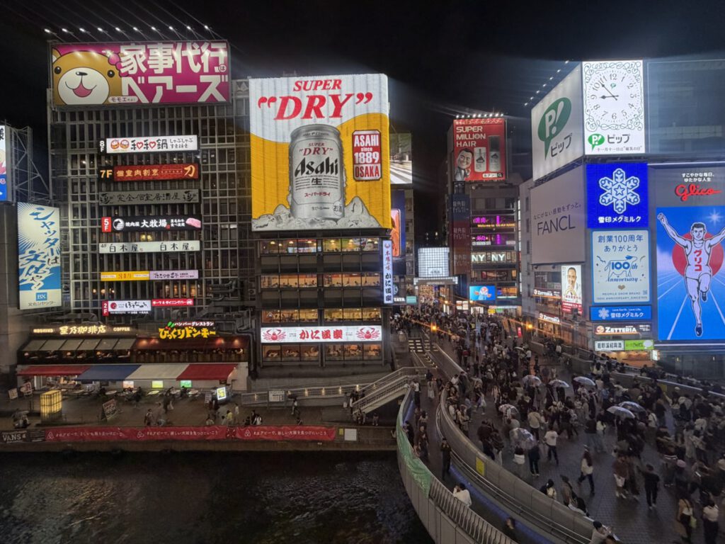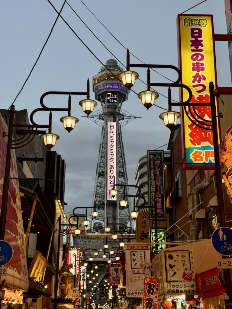 Danach streiften wir durch weitere Shopping-Plazas und fielen über Moomin-Motive her – überraschend, aber offenbar beliebt: Die liebevoll gestalteten Figuren und Bezüge zur finnischen Moomin-Welt scheinen auch in Japan Fans zu haben, und oft sieht man Merchandise oder Kooperationen in Shops. Am Abend Richtung Tsutenkaku Tower: Mit dem Osaka Amazing Pass durften wir auch diese Aussichtsplattform betreten. Es war einiges Warten angesagt, bis wir den Aufzug nutzen konnten, doch oben wurden wir mit Blick über Osaka belohnt. Der Tsutenkaku Tower, ein Symbolviertel des alten Osaka, steckt voller Geschichte und Charme. Danach kehrten wir in ein nahegelegenes Restaurant ein und ließen den Abend mit einem Sake-Reisschnaps ausklingen. Gegen 22:30 Uhr waren wir wieder im Hotel, packten unsere letzten Klamotten und verstaute unsere Souvenirs – Morgen Abend, zur gleichen Zeit, geht’s schon wieder heimwärts.
