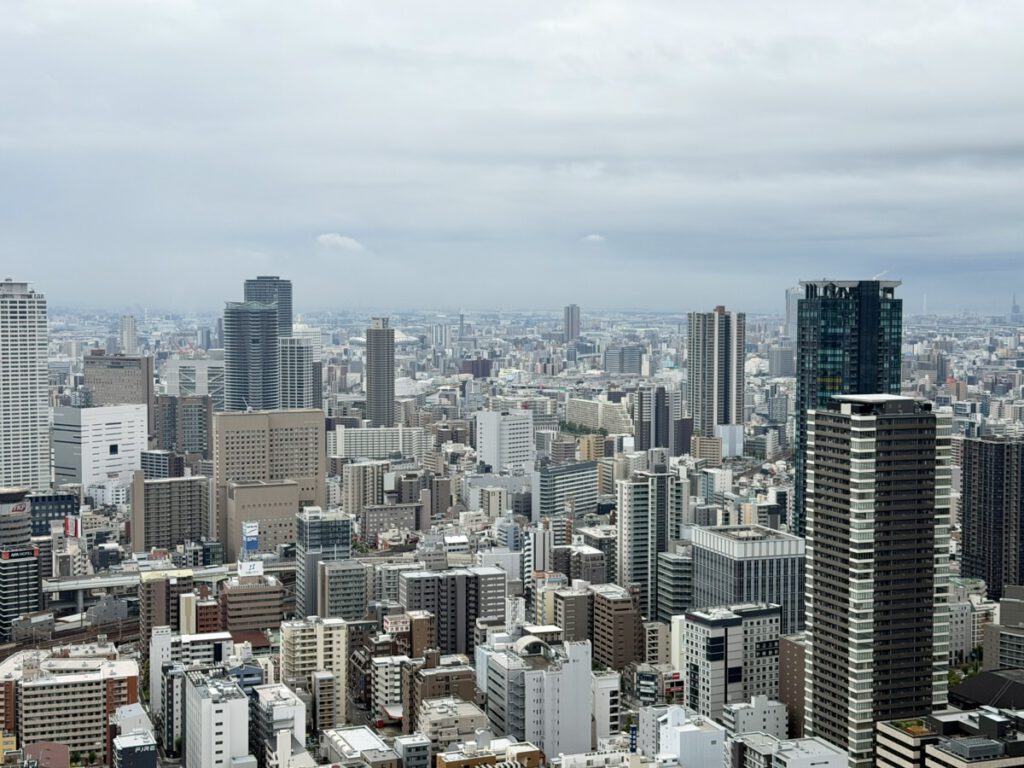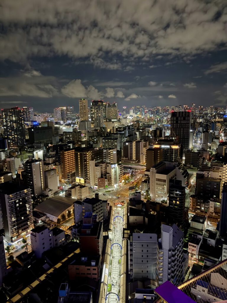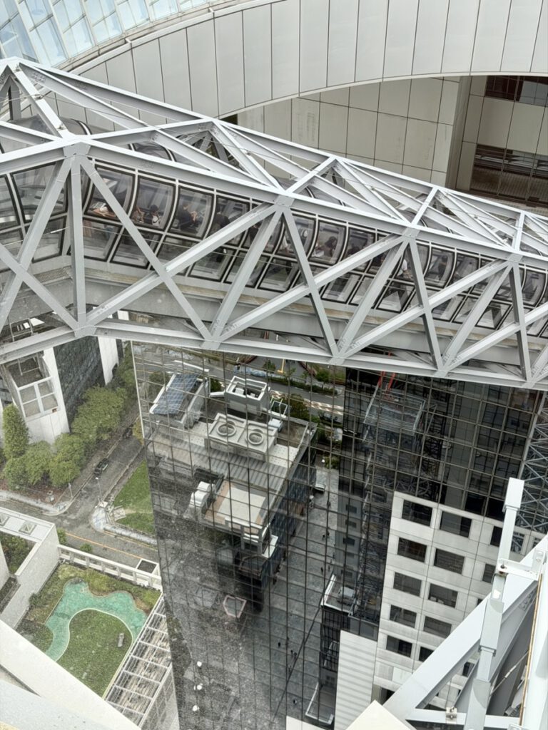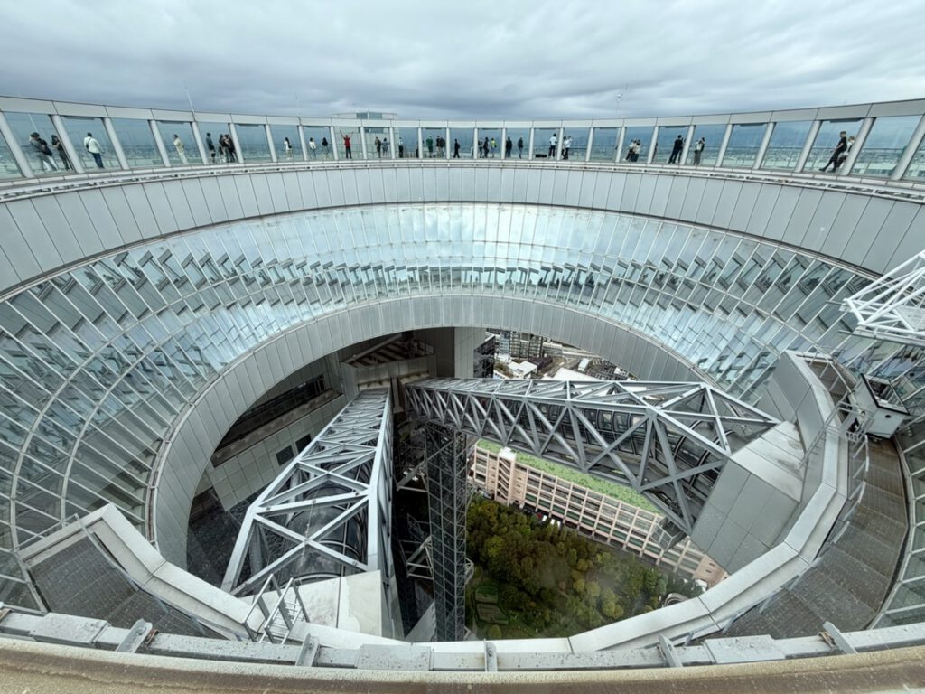Der Sonntag verlief ähnlich entspannt, aber mit neuen Entdeckungen. Ein typischer Tag begann mit einem ausgiebigen Frühstück, danach fuhren wir zum Umeda Sky Building und bestiegen das Kuchu Teien Observatory (Floating Garden Observatory) – ein Observatorium, das die beiden Türme des Gebäudes verbindet und Panoramablicke auf Osaka bietet. Das Gebäude ist 173 Meter hoch, besteht aus zwei Türmen mit etwa 40 Stockwerken, verbunden durch Brücken und Aussichtsplattformen. Der Weg nach oben führt durch gläserne Aufzüge und eine „sky escalator“, die an einer Öffnung des Atriums entlangfährt – ein visueller und räumlicher Effekt, der das Erlebnis verstärkt. Von oben erfassten wir eindrucksvoll, wie weitläufig die Stadt ist.