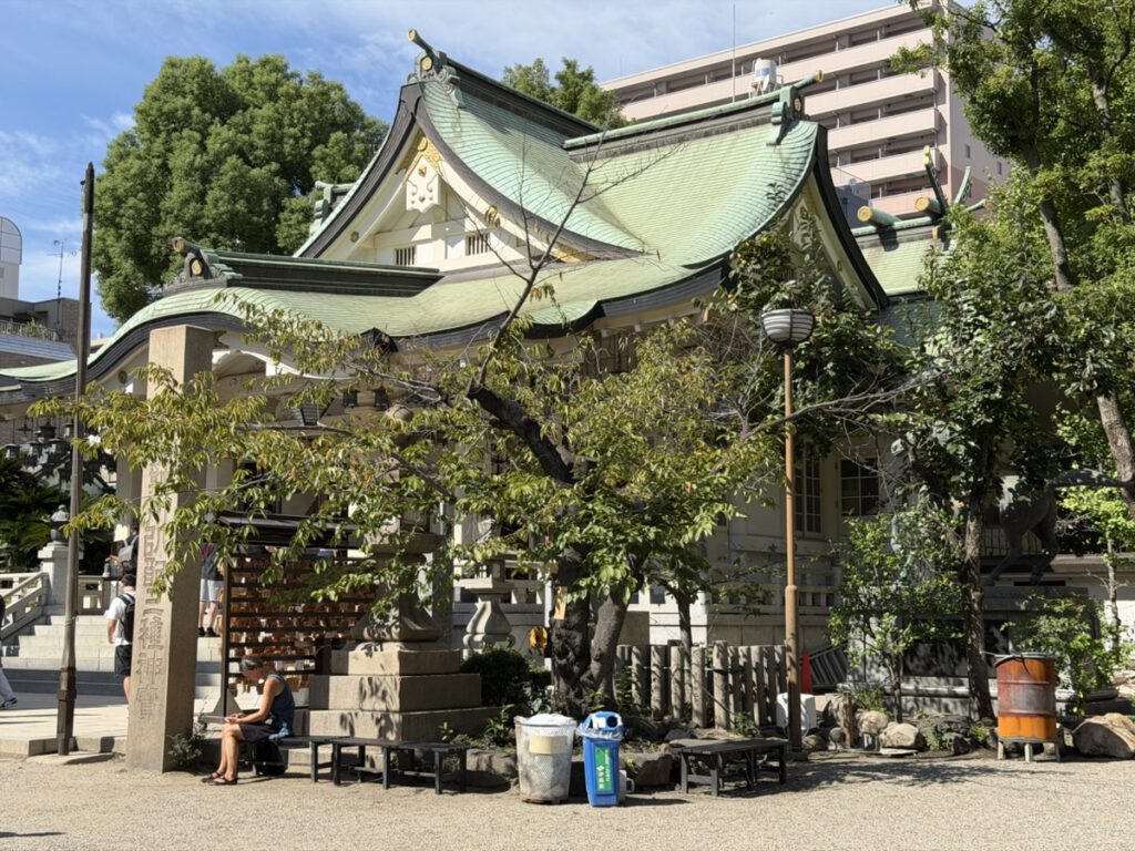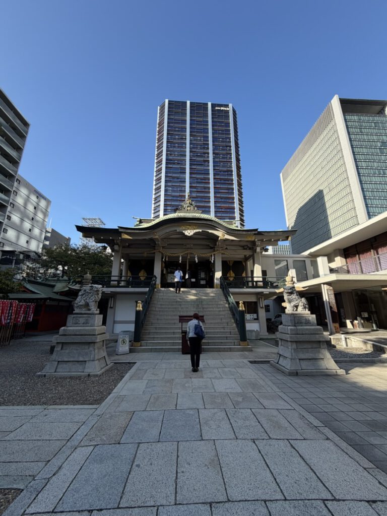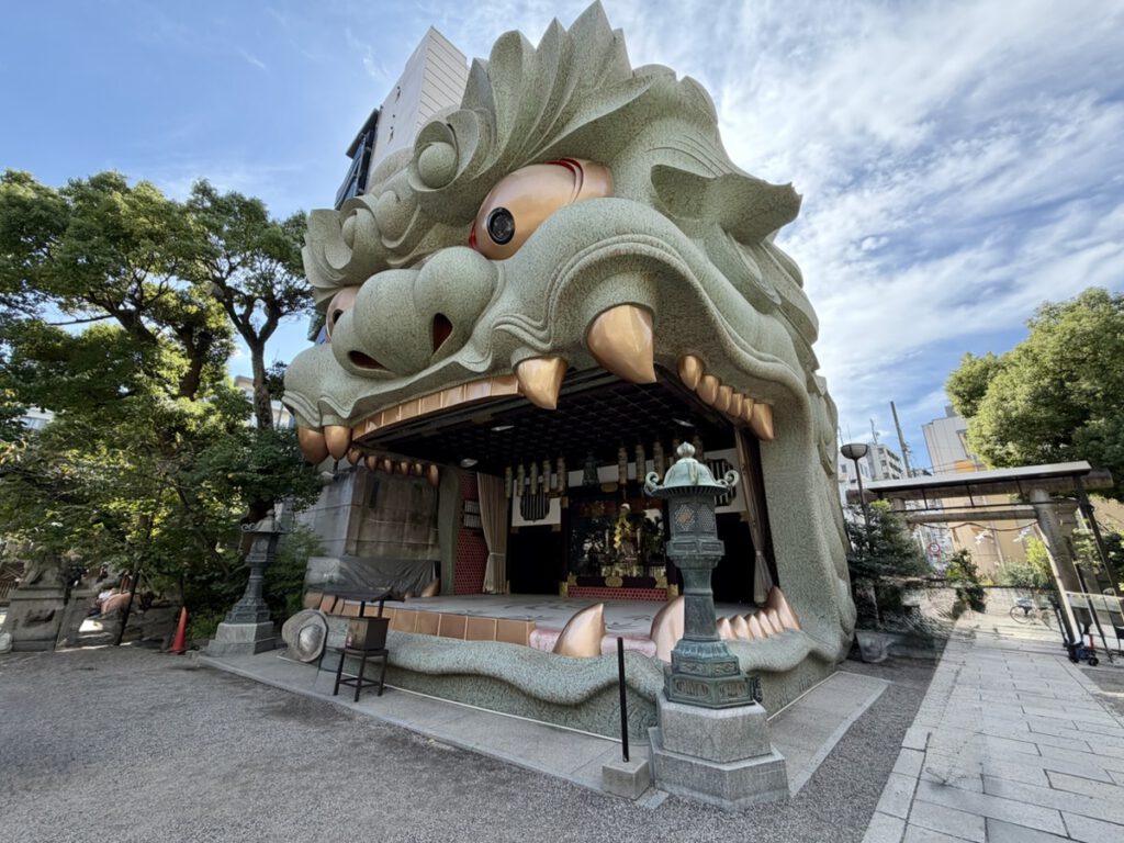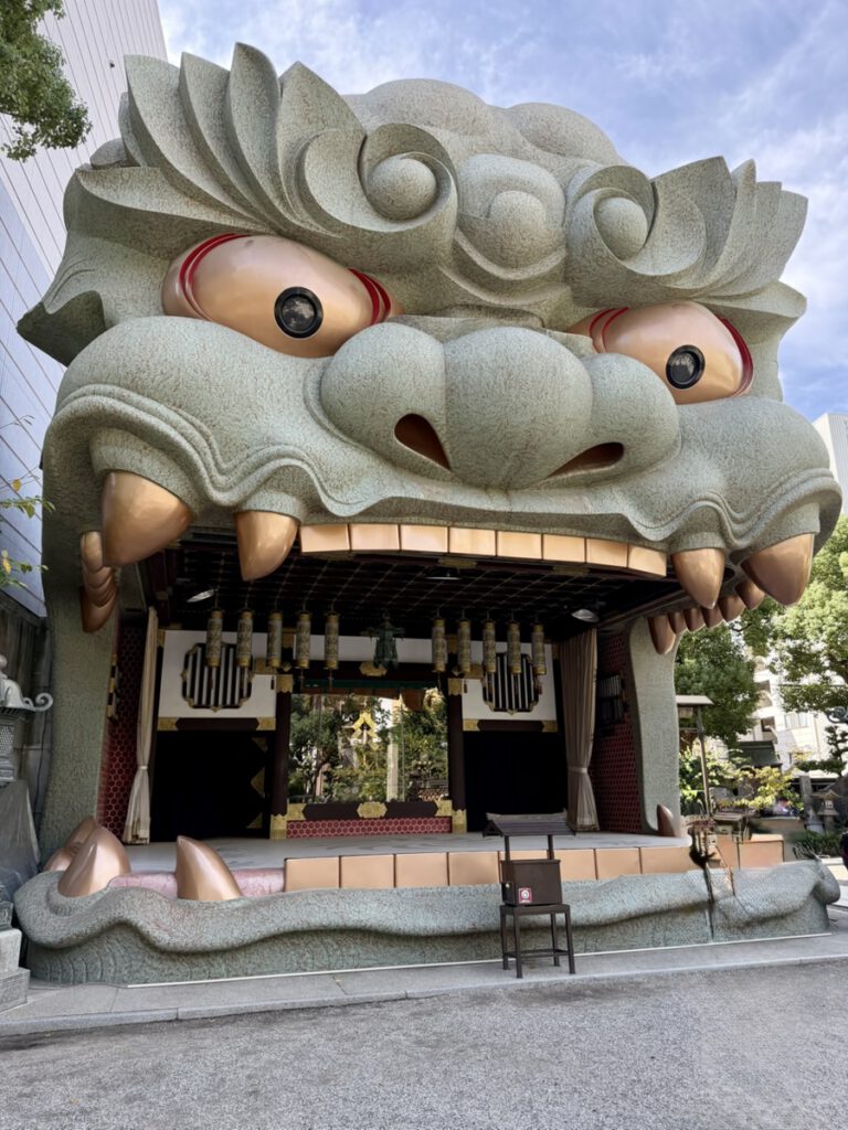 Von dort schlenderten wir weiter und erreichten schließlich den Namba Yasaka Shrine. Dieser Schrein ist besonders bekannt für sein beeindruckendes Löwenkopfgebäude (Shishiden oder Ema-Den), das etwa 12 Meter hoch und 11 Meter breit ist und eine Bühne im Maul des Löwen besitzt. Dieser dramatische Löwenkopf wird traditionell so interpretiert, dass er böse Geister verschlingt und so Schutz und Glück bringt – besonders beliebt sind Gebete um Erfolg, insbesondere in Schule oder Beruf. Der Schrein ist Teil des Shintō-Glaubens und verehrt unter anderem Susanoo-no-Mikoto, den Sturmgott, der in der japanischen Mythologie den achtköpfigen Drachen Yamata-no-Orochi besiegte. Seine Geschichte steht sinnbildlich für Mut, Reinigung und das Überwinden des Chaos – Werte, die tief im japanischen Glaubensverständnis verwurzelt sind. Der Schrein selbst wurde in seiner heutigen Form 1974 errichtet, doch seine Ursprünge reichen weit zurück. Zwischen modernen Gebäuden wirkt er wie eine kleine spirituelle Insel, auf der man innehalten und durchatmen kann.