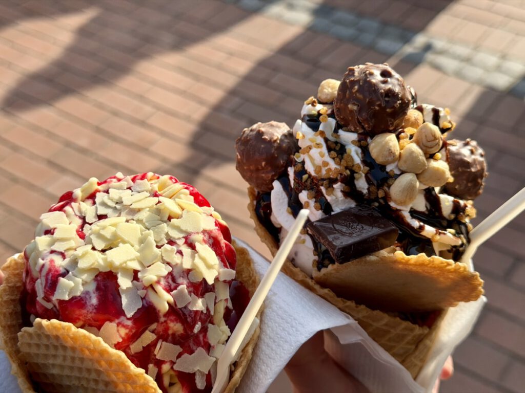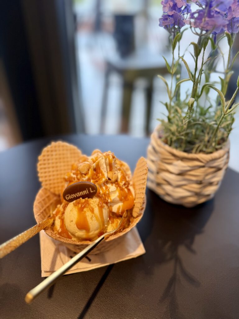 Dienstag (10.03.26) – Geburtstag mit Überraschungen: Der Dienstag begann für mich mit vielen Glückwünschen, denn es war mein Geburtstag. Was genau für den Tag geplant war, wusste ich allerdings nicht – Lisa hatte offenbar etwas vorbereitet und ich ließ mich einfach überraschen. Nach einem gemütlichen Frühstück im Hotel und einigen Gratulationen von Familie und Freunden sind wir zurück ins Apartment gegangen und haben erstmal eine Runde Mario Kart World gespielt. Das Wetter zeigte sich an diesem Tag etwas wechselhafter, sodass wir es ruhig angehen lassen konnten, bevor sich die Sonne wirklich durchsetzte. Gegen Mittag machten wir uns auf den Weg zu einer Eisdiele – denn wir hatten uns ein ambitioniertes Urlaubsziel gesetzt: jeden Tag mindestens ein Eis. Während wir bei Giovanni L. gerade unsere Sorten ausgesucht hatten, wurde ich plötzlich von zwei Freunden überrascht. Benny und Stephie waren „zufällig“ ebenfalls in der Gegend und haben mich dort erwartet – eine richtig schöne Geburtstagsüberraschung.
