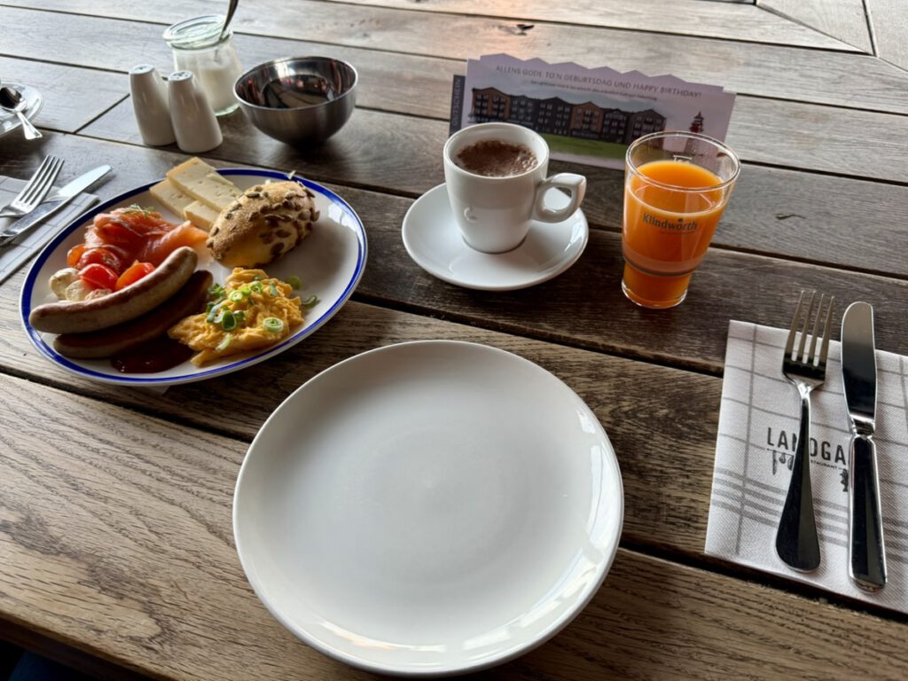 Sonntag – Anreise nach Büsum: Nachdem wir am Sonntagvormittag noch ein paar letzte Handgriffe in der Wohnung erledigt hatten, haben wir unser Gepäck in den Skoda geladen und uns auf den Weg Richtung Nordsee gemacht. Die Fahrt verlief größtenteils entspannt, auch wenn uns eine Baustelle auf der Autobahn etwas ausgebremst hat – von drei Spuren auf eine reduziert sorgt dann doch schnell für Geduldstraining. Am Ende sind wir gegen 15:30 Uhr in Büsum angekommen und konnten unser Apartment im Lighthouse Hotel beziehen. Unsere Wahl fiel bewusst auf ein Apartment, denn auch im Urlaub möchten wir nicht komplett von Restaurants abhängig sein. Mal eine Lasagne kochen oder einfach etwas Kleines selbst zubereiten gehört für uns dazu. Für die nächsten Tage stand also ein kulinarischer Mix auf dem Programm: Fischbrötchen an der Nordsee, vielleicht ein Candle-Light-Dinner – und zwischendurch auch etwas Selbstgekochtes. Nach der Ankunft haben wir erstmal in Ruhe ausgepackt, uns eingerichtet und den ersten Blick Richtung Nordsee genossen.